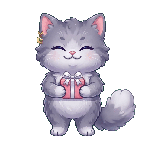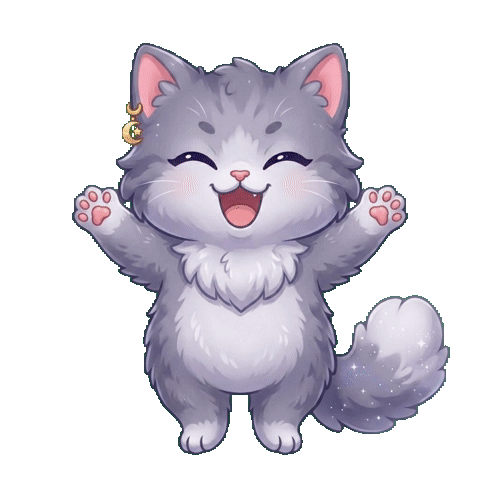 A fluffy cosmic cat with a gold crescent moon charm and stars in her eyes. Chibi, kawaii, and absolutely invested in your love life.